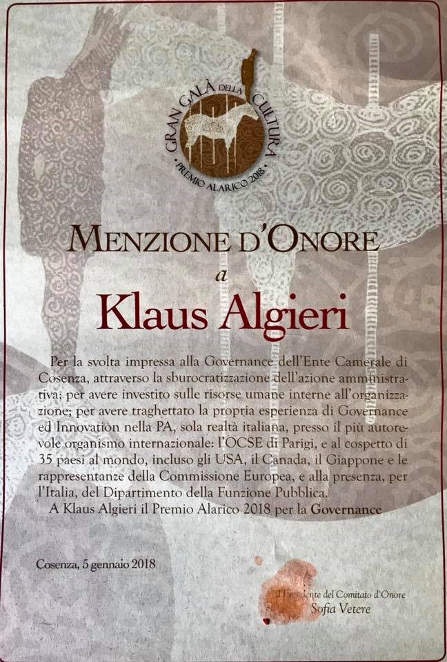 Il Premio Alarico 2018 per la Governance è stato assegnato al Presidente della Camera di Commercio di Cosenza, Klaus Algieri. Nella motivazione del riconoscimento, organizzato dalla M.E.A. produzioni con il Patrocinio del Comune di Cosenza, è stata menzionata la svolta culturale di #OpenCameraCosenza, spiegata a Parigi nella sede dell'Ocse dallo stesso Presidente.