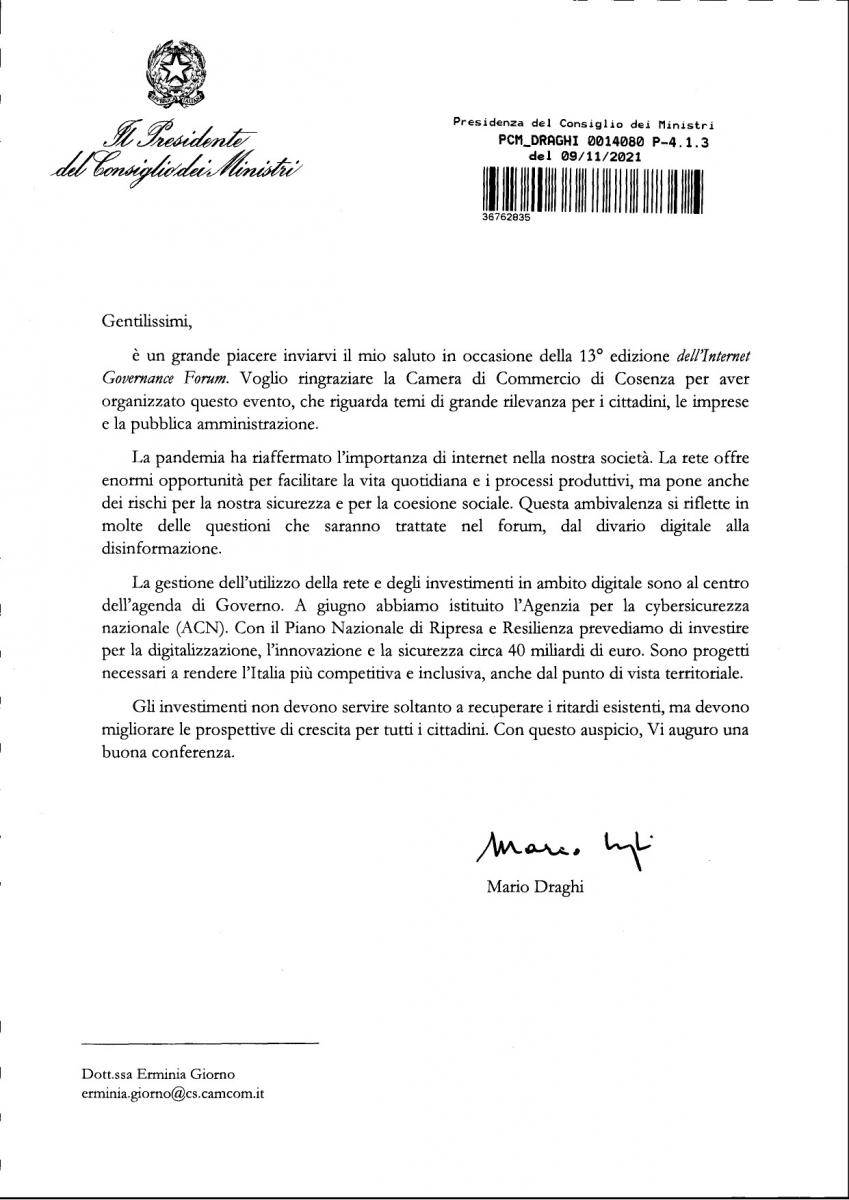 Lettera del Ministro Valeria Fedeli alla Camera di Commercio di Cosenza