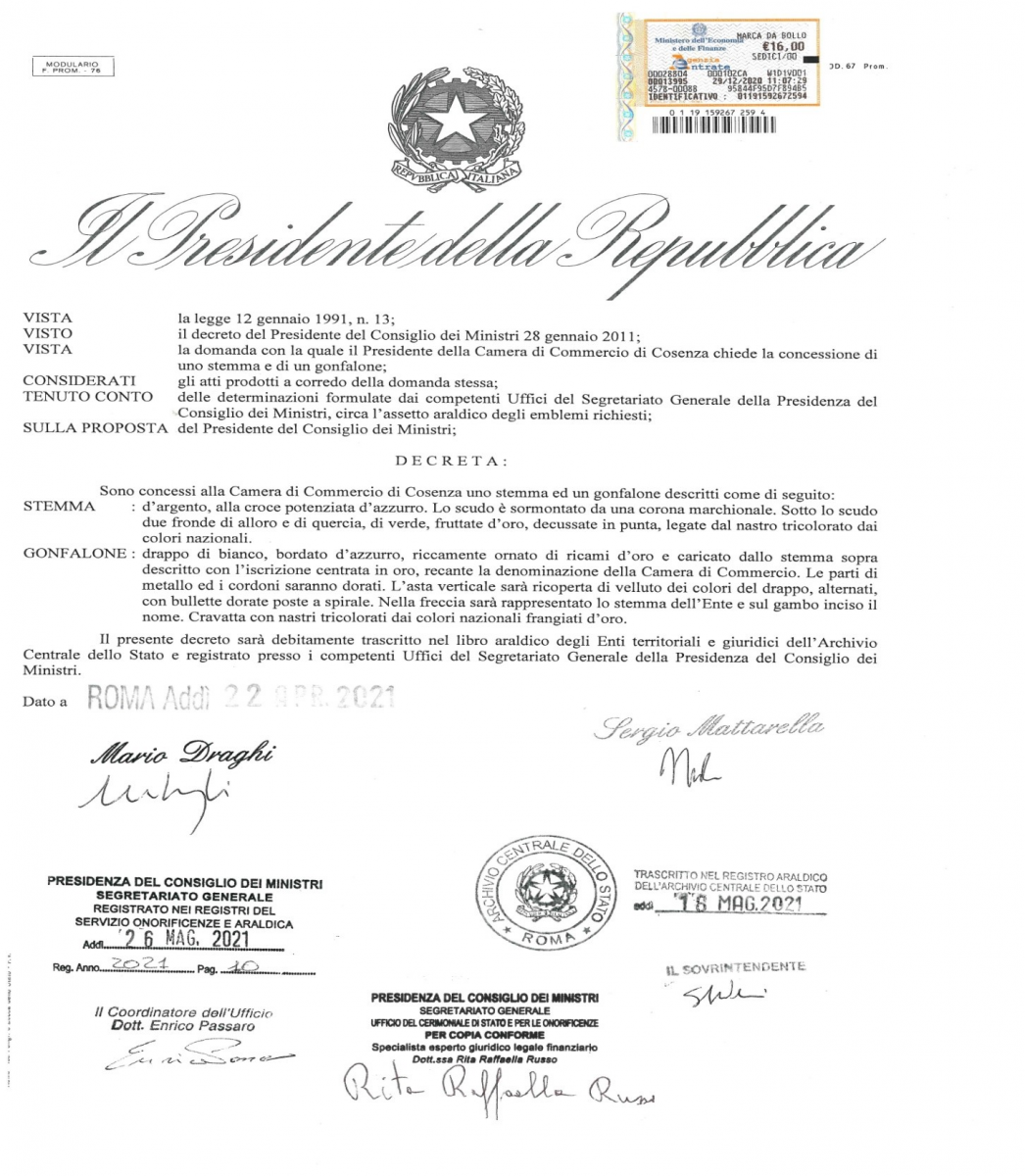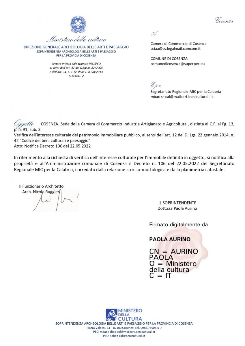 Il Ministero della cultura - Direzione Generale archeologia belle arti e paesaggio - con Decreto n. 106 del 22.05.2023 ha dichiarato l’immobile che ospita la Sede della Camera di Commercio Industria e Artigianato di Cosenza “di interesse culturale ai sensi dell’art. 10, comma 1 titolo I capo I del Codice dei Beni Culturali”.