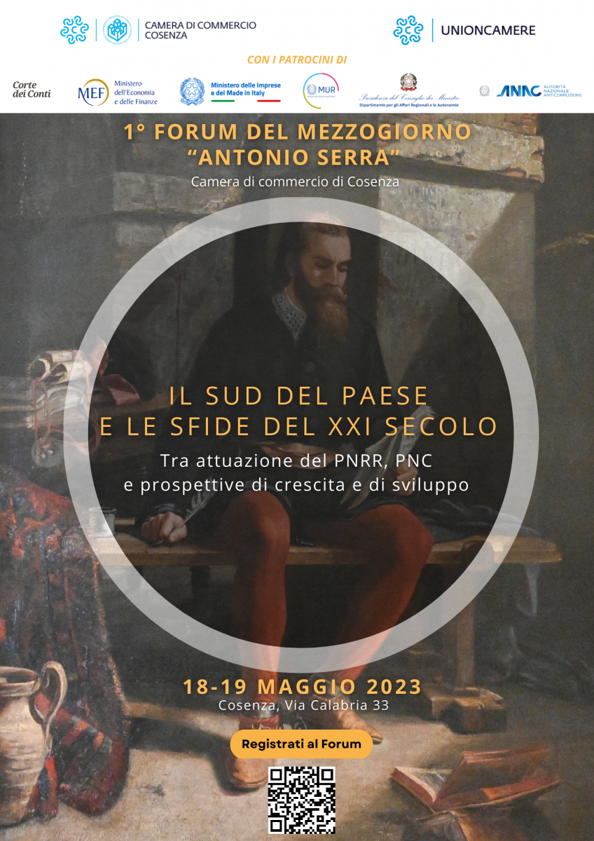 Il 18 e 19 maggio 2023 la Camera di commercio di Cosenza, in collaborazione con Unioncamere, e con il patrocinio di Corte dei Conti, Ministero dell' Economia e delle Finanze, Ministero delle Imprese e del Made in Italy, Ministero dell' Università e della Ricerca, Dipartimento per gli Affari Regionali e le Autonomie e ANAC, oltre che della maggior parte degli Ordini professionali della provincia di Cosenza, ha ospitato per la prima volta il 1° Forum del Mezzogiorno “Antonio Serra” – Il Sud del Paese e le sfide del XXI secolo.