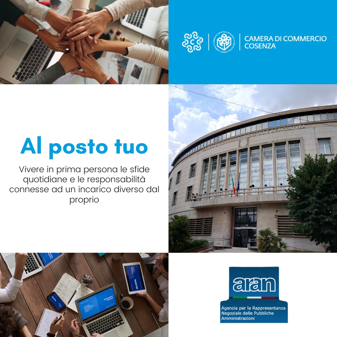 Il progetto "Al posto tuo...", ideato della Camera di commercio di Cosenza e promosso in collaborazione con l’Agenzia per la Rappresentanza Negoziale delle Pubbliche Amministrazioni (ARAN), nasce col fine di permettere ai dipendenti di vestire per un giorno i panni di un collega della Camera, oppure di un’altra amministrazione (e viceversa), vivendo in prima persona le sfide quotidiane e le responsabilità connesse ad un incarico diverso dal proprio.