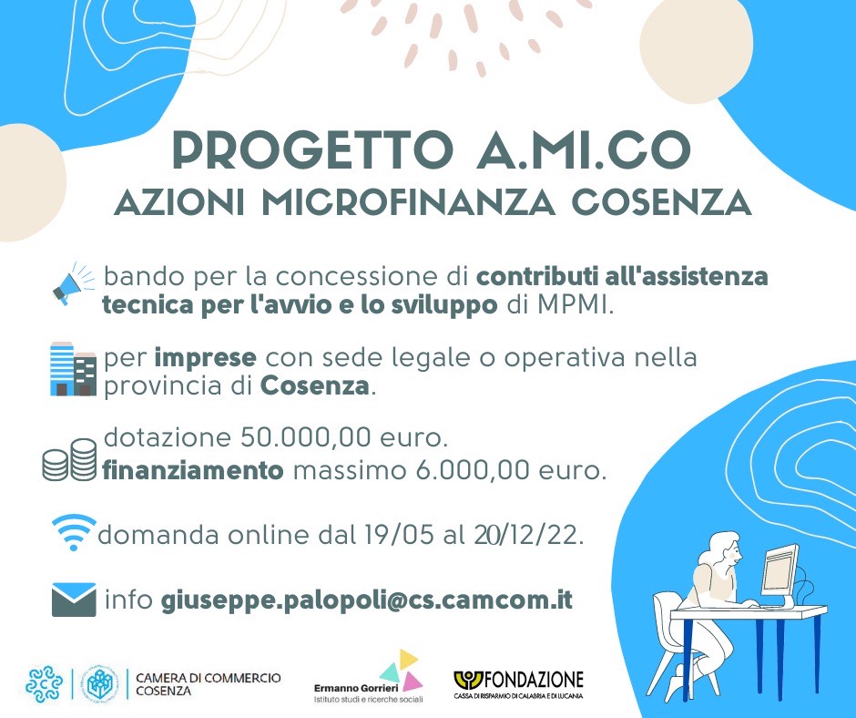 Continua l’attività della Camera di Commercio di Cosenza in collaborazione con la Fondazione Carical e gli esperti dell’istituto Ermanno Gorrieri, al fine di sostenere le MPMI (Micro Piccole o Medie Imprese) – in adesione al Progetto A.Mi.Co, Azioni di Microcredito Cosenza II edizione.