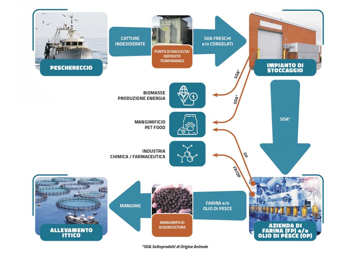 Il mercato si inserisce in una nuova filiera circolare attraverso cui le catture indesiderate, in un’ottica di valorizzazione di una “materia prima” che altrimenti rischierebbe di essere qualificata e trattata come rifiuto, diventano sottoprodotti di origine ittica per la produzione di farine e/o oli di pesce, e quindi componenti di mangimi per l’acquacoltura.