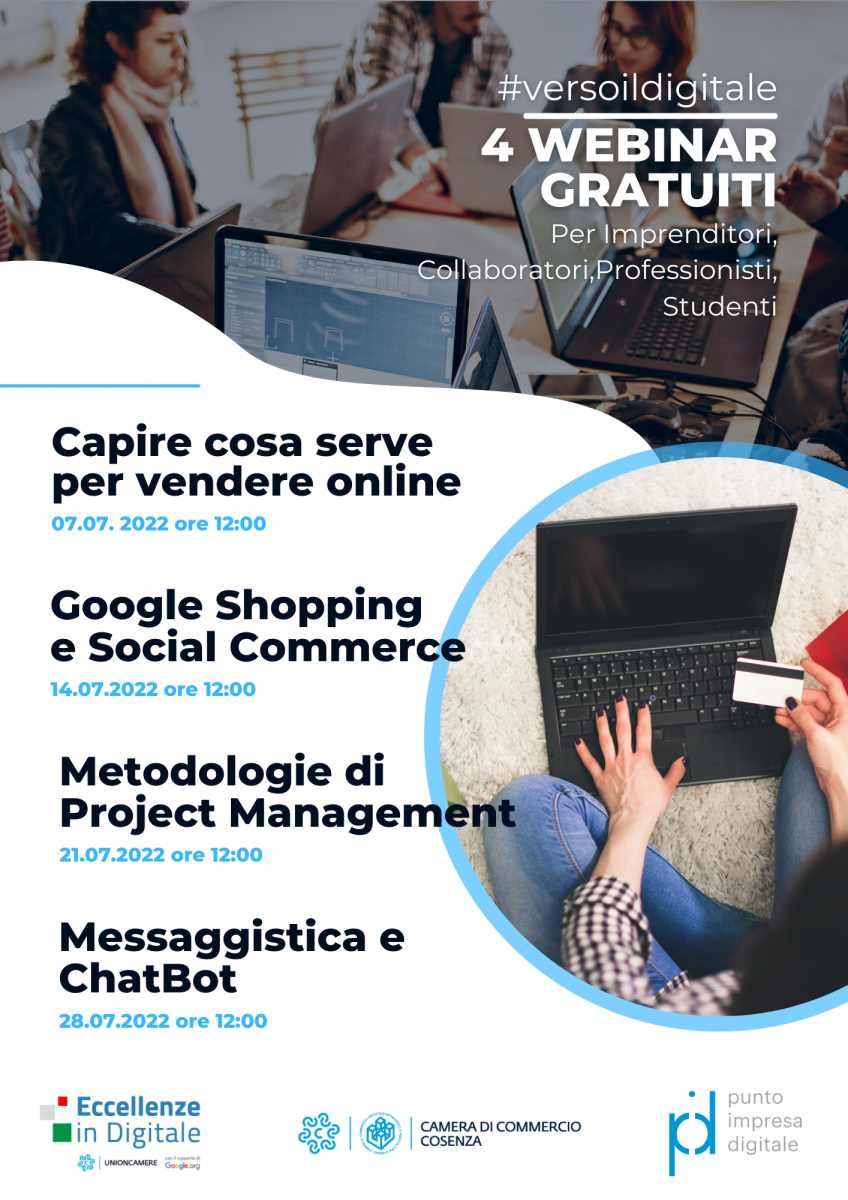 La Camera di Commercio di Cosenza attraverso il suo Punto Impresa Digitale, nell'ambito del progetto Eccellenze in Digitale di Unioncamere e Google.org, ha programmato 4 eventi per il mese di luglio.