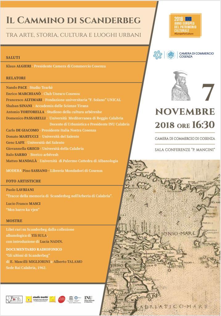 Giorno 7 novembre 2018, alle ore 16,30 la Camera di Commercio organizza un evento culturale in linea con le finalità del Ministero per i Beni e le Attività Culturali, in riferimento all’anno della cultura Europea, intitolato “Il cammino di Skanderbeg tra storia, arte, cultura e luoghi urbani”.