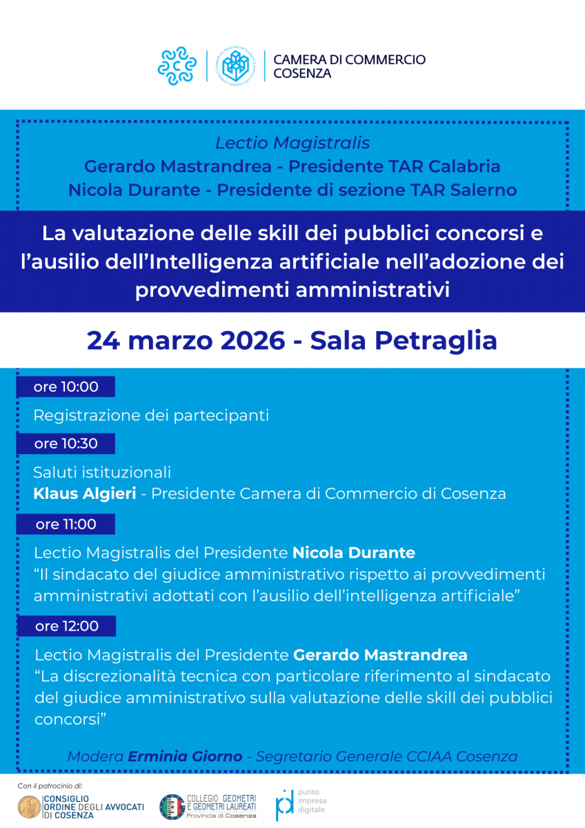 Il 24 marzo alla Camera di Commercio di Cosenza si terrà un incontro istituzionale sul tema "La valutazione delle skill dei concorsi pubblici e l’ausilio dell’intelligenza artificiale nell’adozione dei provvedimenti amministrativi”.