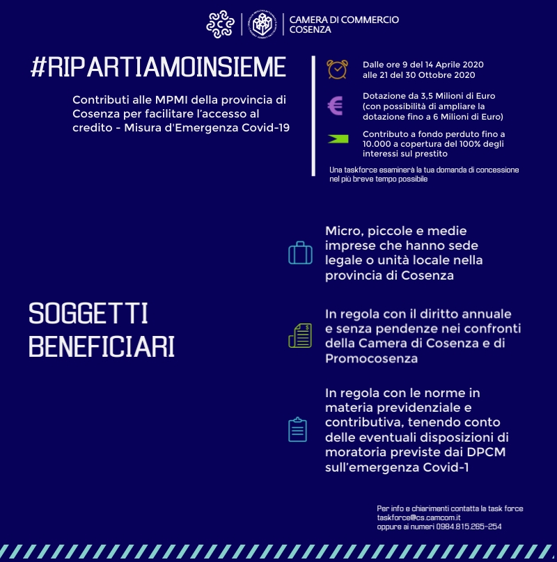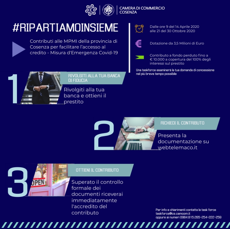 La Camera ha attivato anche uno sportello dedicato al micro-credito, che fa capo sempre alla task force, per stimolare e supervisionare l'azione del Fondo Garanzia PMI, Cassa Depositi e Prestiti e ISMEA a supporto delle imprese cosentine.