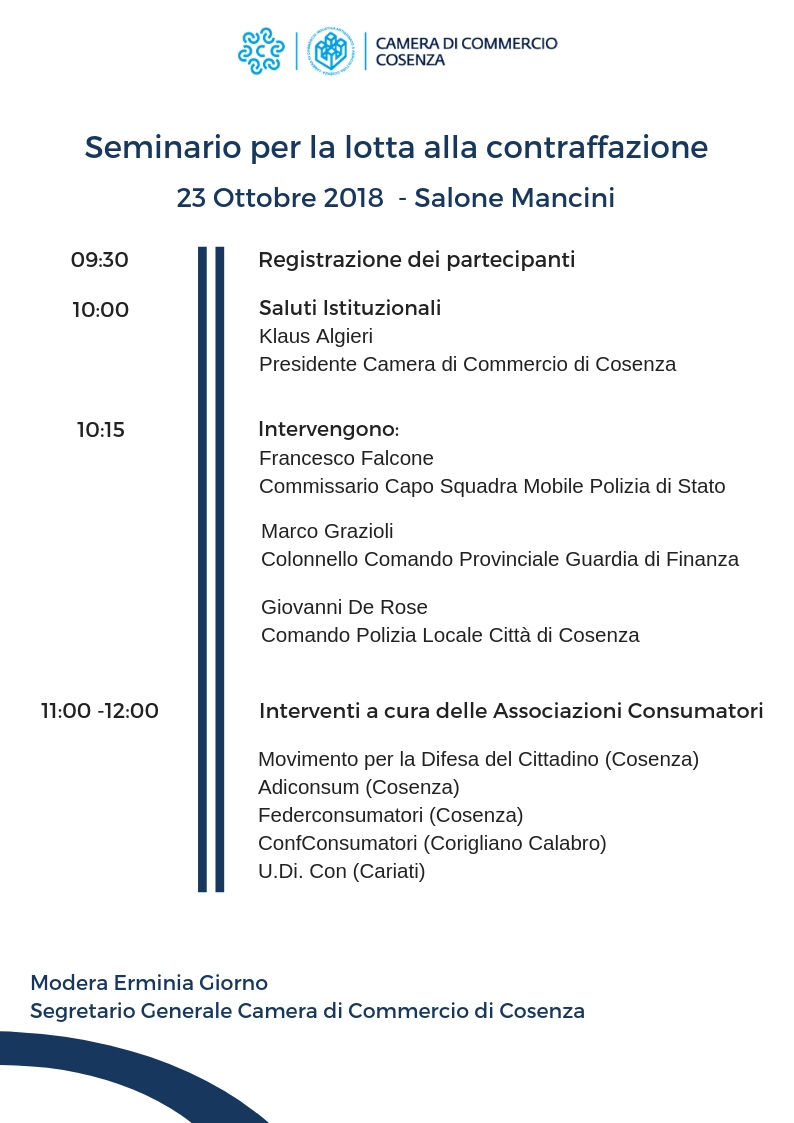 Nella giornata del 23 ottobre 2018 (ore 09:30 - 12:00), che vedrà la presentazione di tali progetti, ascolteremo anche le forze dell'ordine che operativamente svolgono attività di lotta alla contraffazione.