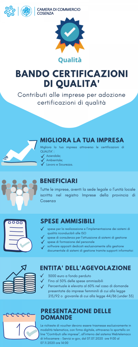 Con il presente Bando la Camera di commercio di Cosenza concede contributi per incentivare l’introduzione del sistema di certificazione di qualità aziendale e/o ambientale e/o inerente la sicurezza dei lavoratori nelle imprese di tutti i settori economici, secondo le norme ISO 9000 e ISO 14000 (2015-2020), Regolamento EMAS e ISO 45000 OHSAS 18001.