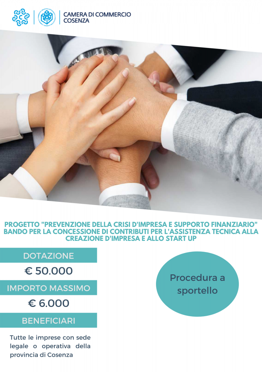 fbpx PROGETTO “PREVENZIONE DELLA CRISI D’IMPRESA E SUPPORTO FINANZIARIO” BANDO PER LA CONCESSIONE DI CONTRIBUTI PER L’ASSISTENZA TECNICA ALLA CREAZIONE DI IMPRESE ALLO START UP – ANNO 2022 | Camera di Commercio di Cosenza