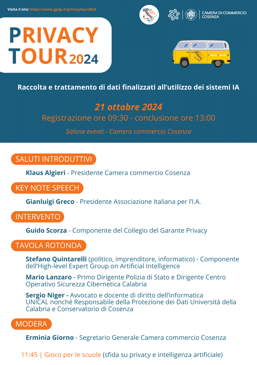 La Camera di commercio di Cosenza aderisce al “Privacy Tour 2024, un’iniziativa dell’Autorità Garante della Privacy per promuovere la cultura della protezione dei dati e l’uso consapevole delle nuove tecnologie.